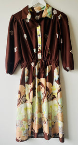 Pretty brown flower pattern vintage 1970s mid length dress M- Regular price