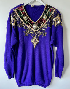 Glam 1980s vintage ladies decorated purple knitted V-neck jumper L- Regular price